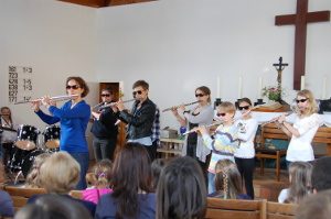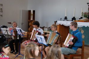 Die Querflötenklasse von Johanna Kattenborn-Klein betrat Neuland und führte, gestylt mit dunklen Sonnenbrillen, die Choreographie „Dance with me“ von Wil Offermans mit acht Querflöten und synchronisierten Bewegungen auf. Es folgten die Akkordeonschüler Stefan Hemmis und Tobias und Leo Zander mit der Petite Lucienne von Thilo Schlunck.