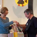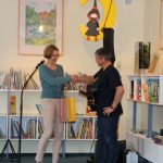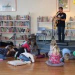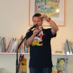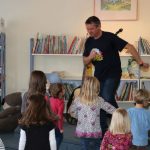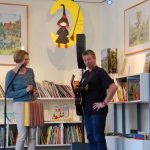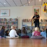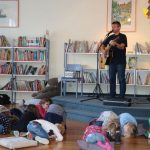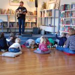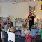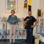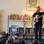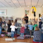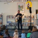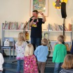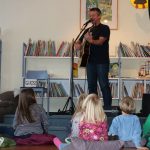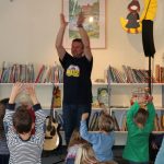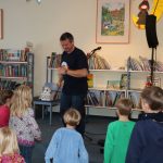 In diesem Jahr waren dies „Herr Müller und seine Gitarre“, die sich dann auch gleich mit einem Quatschlied, den Geschichten aus dem Schummelbuch vorstellten. Der Kinderliedermacher bezog die Kinder in alle seine Lieder mit ein und animierte sie zum Mitmachen. Bei dem Lied über die vielen Herr Müllers aus den verschiedenen Berufen konnten alle mitsingen, sogar die Erwachsenen. Auch Popcorn wurde musikalisch zubereitet: Beim Aufwärmen der Herdplatte hüpften die Kinder als Popcornkörner erst langsam und dann immer schneller. Plötzlich tauchte ein Paket auf der Bühne auf, das beschriftet war mit „Ghost“ und von Hugo und Janne geöffnet wurde. Beim anschließenden Spuken half das Publikum lautstark mit. Aber auch die Marionette Friedrich tanzt gern. Sie machte es vor und die Kinder machten es nach: Marionetten wollen steppen und auch rappen. Die schlechte Laune von der das Lied „Klaus die Laus“ erzählt, wurde mit einem Tänzchen vertrieben. Aber weil die Kinder noch nie in der Disco waren, mussten die Erwachsenen Vorbild sein und erstmal vormachen, wie das geht. Und weil tanzen durstig macht, gab es anschließend ein Lied über die Cola. Das Lieblingsgetränk aller Kinder, das die Erwachsenen aber immer verbieten. Nach dem melodiösen „Ich mag dich so wie du bist, so mag ich dich“ bedankte sich die Musikschulvorsitzende Petra Freund mit einem Präsent bei Jürgen Müller und der Gitarre für das tolle Konzert und bei Büchereileiter Patrick Hein-Becker für die gute Zusammenarbeit.  Mit dem Bewegungslied „Tanz den Müller“ tanzten dann alle bis zum Schluss.